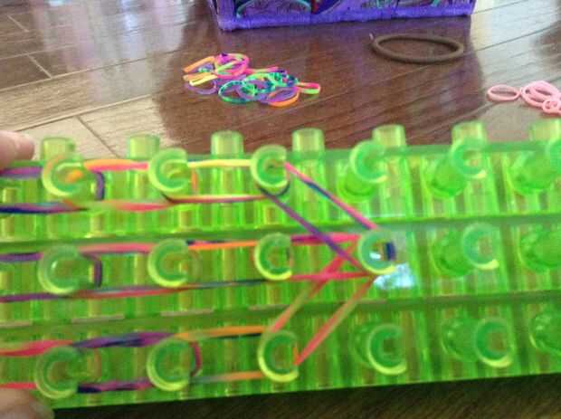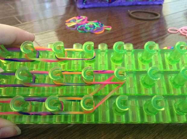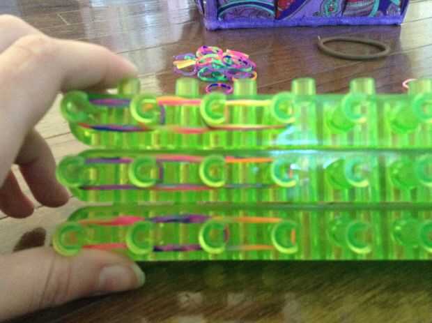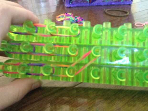 En primer lugar, usted necesita su telar en posición paralela. BANDAS doble lugar hasta cuatro clavijas tienen bandas en todas las filas. Ahora cierra pulg (usando bandas dobles)