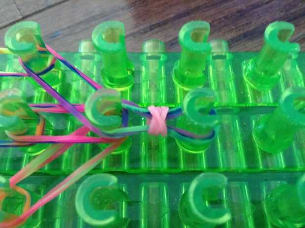 Para el centro, necesita 2 bandas A y banda B 1. Envuelva su banda B alrededor de su gancho de cuatro veces. Tomar sus bandas A y deslice la banda B en ellos. Coloque en el centro en las filas de donde son sus bandas mediados.