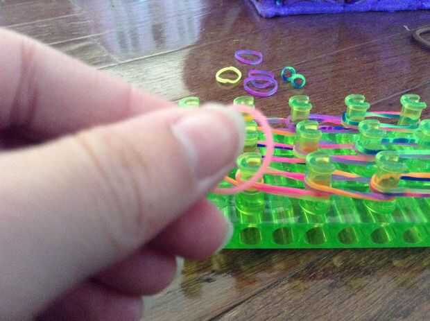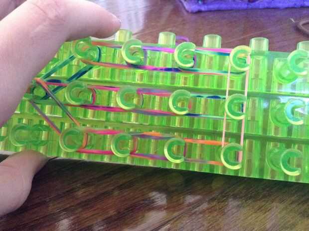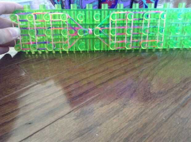 Coloque bandas (uno a la vez) a través de todas las filas. Usted cubrirá cuatro filas de clavijas en cada lado. No deje un espacio al final de la primera parte!