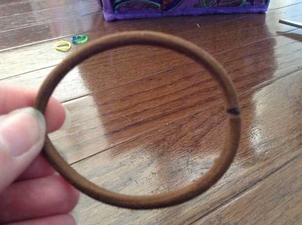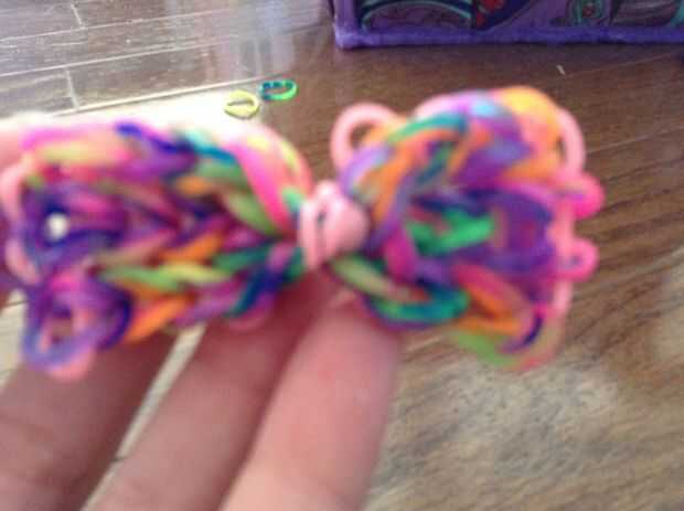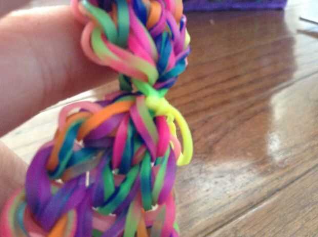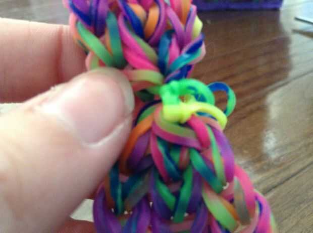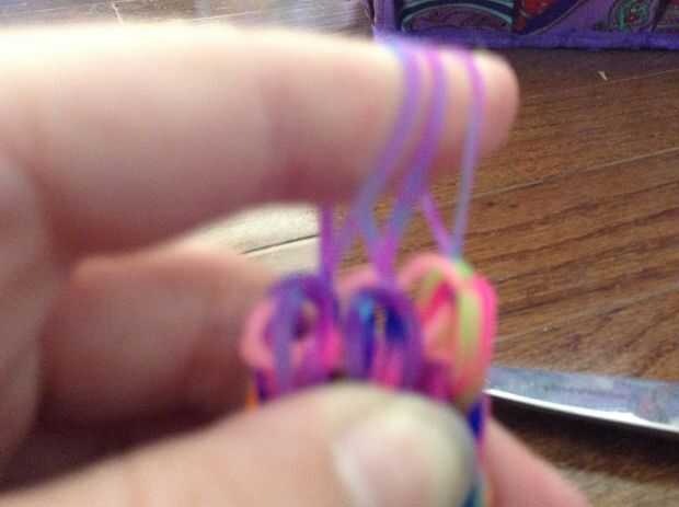 Para comenzar, cortamos los lazos del extremo. Entonces nosotros deslizamiento del nudo dos bandas a través de las bandas de medio fondo. Tome el lazo del pelo, la banda, lazo encima y tire a través al otro lado. Se trata básicamente de un nudo del resbalón en el lazo del pelo. Repita con la otra banda.