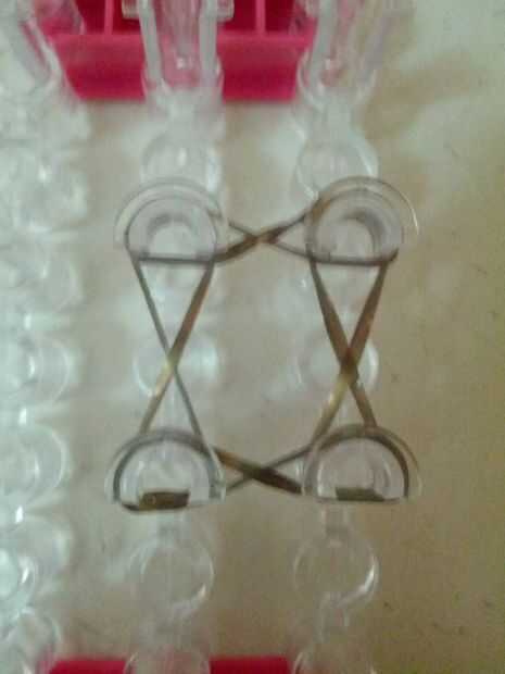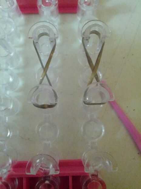 Tomar 4 bandas y gire luego en figura de ochos y los coloca en el telar como se muestra.