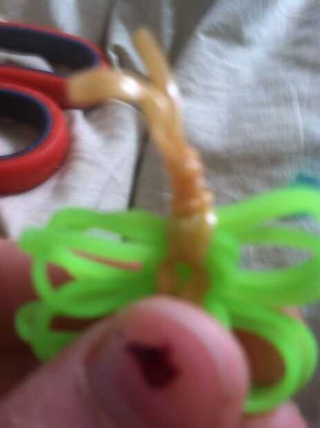 Con sus gomas vamos a hacer la cabeza y rayas. Gire su primera banda de goma alrededor de los 2 bucles en la parte superior de la mariposa hasta que quede muy apretado, que es la cabeza.