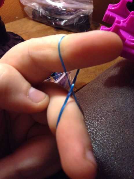 manera fácil de hacer una pulsera de cola de pescado en cualquier lugar.Paso 1: materiales Todo lo que necesitas esSu elección de colores de gomasy un clip C o SPaso 2: Poner la primera banda de goma de color en una figura de ocho en los dos dedos. P
