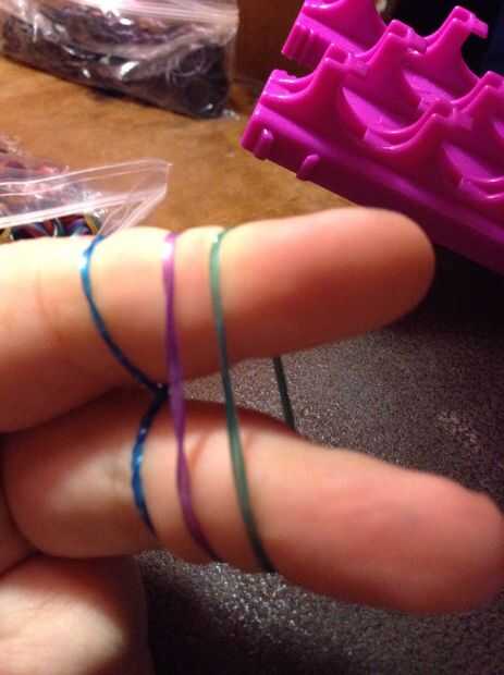 manera fácil de hacer una pulsera de cola de pescado en cualquier lugar.Paso 1: materiales Todo lo que necesitas esSu elección de colores de gomasy un clip C o SPaso 2: Poner la primera banda de goma de color en una figura de ocho en los dos dedos. P