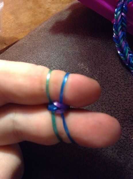 manera fácil de hacer una pulsera de cola de pescado en cualquier lugar.Paso 1: materiales Todo lo que necesitas esSu elección de colores de gomasy un clip C o SPaso 2: Poner la primera banda de goma de color en una figura de ocho en los dos dedos. P