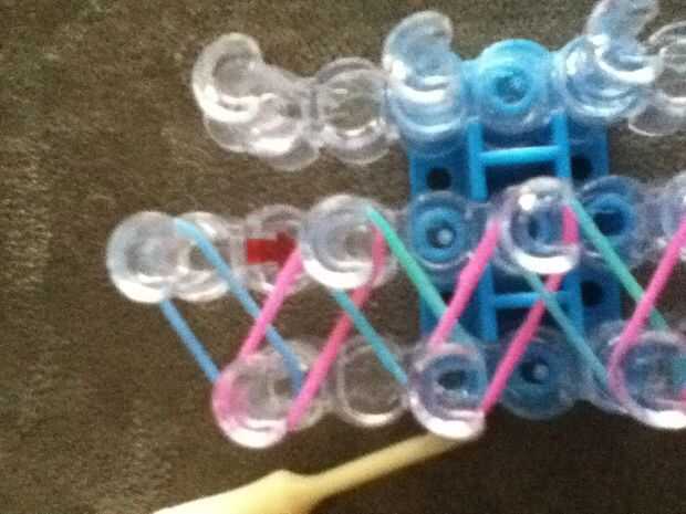 se necesita: un telar del arco iris, un gancho, bandas de goma y de un ' clip o clip de 'c'.Paso 1: Colocación de las bandas Con las bandas de color de rosa, mueva la banda de la clavija central a la izquierda e ir en línea recta hasta el segundo d a