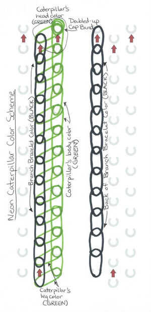 Tomó algún ensayo y error para averiguar que parte del diseño se convirtió en el cuerpo y la cabeza de la oruga, y que se convirtió en la pulsera, así que he creado un par de diseños para mostrar cómo organizar los colores en el telar si desea crear una oruga de neón verde, o una oruga de monarca o incluso la "oruga muy hambrienta" (V.H.C. para abreviar).