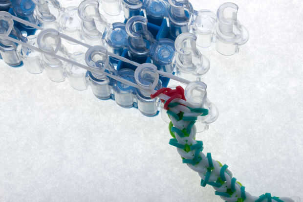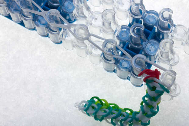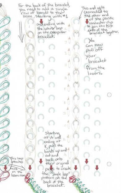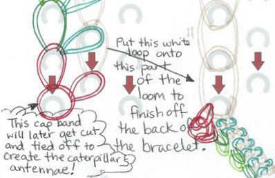 Ahora voltea su telar para que las flechas de telar punto hacia usted. A partir de la banda inmediatamente después del bucle de pulsera de la oruga que colocan en el telar, tire de las bandas hacia arriba y hacia fuera y detrás en sus clavijas originales hasta hacer su manera al extremo del telar. Han completado la parte de atrás de tu pulsera y puede llevarlo a cabo el telar.