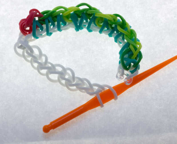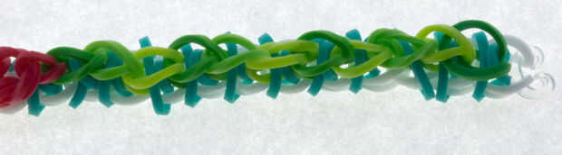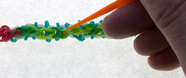 A veces la parte posterior de la pulsera oruga obtiene un poco retorcido tirando del telar. No biggie, solo tire el bucle termina con su gancho hasta que se desenroscan.