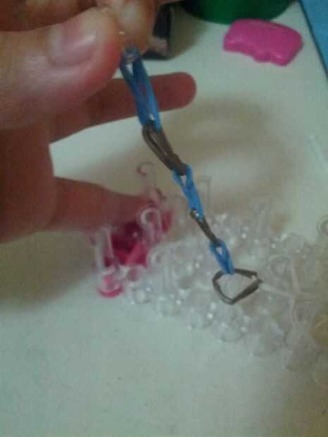 Paso 1: Se necesita:Un telar del arco irisAlgunas gomas de telar del arco irisUn gancho dePaso 2: Colocar las bandas Gire el telar para que la flecha es hacia usted y coloque las bandas (ver imagen)Paso 3: Ahora gire el telar para que la flecha es ha
