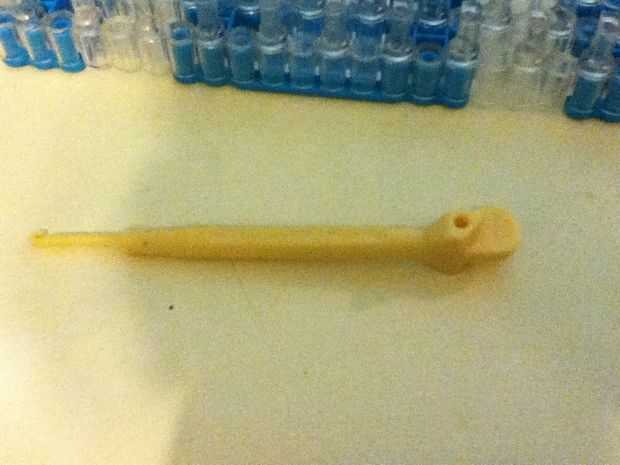 Paso 1: Se necesita:Un telar del arco irisAlgunas gomas de telar del arco irisUn gancho dePaso 2: Colocar las bandas Gire el telar para que la flecha es hacia usted y coloque las bandas (ver imagen)Paso 3: Ahora gire el telar para que la flecha es ha