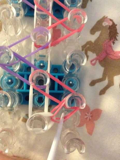 Ahora Coloque el gancho en la banda de goma que acaba enganchado. Tire hacia atrás y agarra la goma y lazo a la mitad diagonalmente