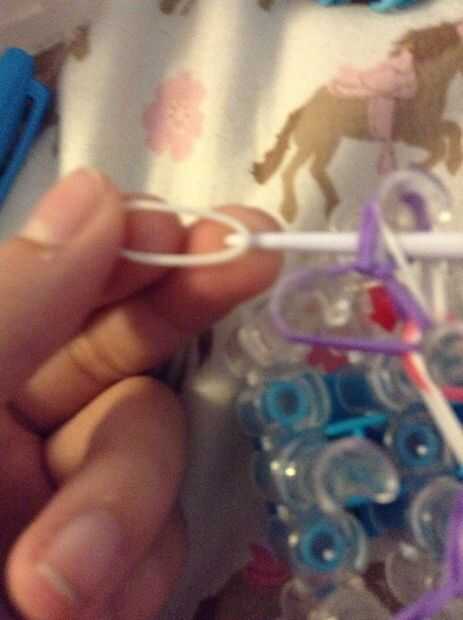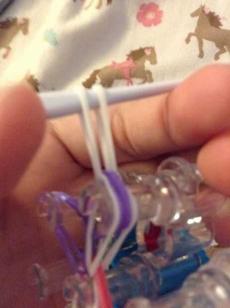 Ahora colocar una banda de goma en el gancho mientras el gancho está en las bandas de caucho enrolladas. Luego retire el gancho para que la goma es la mitad en las bandas de bucles y la mitad hacia fuera. Coloque ambos extremos de la banda de goma en el gancho