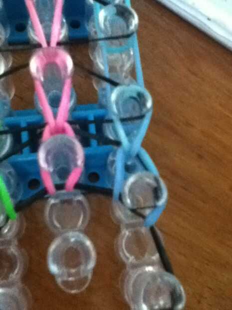 Paso 1: configuración Puesta a punto su arco iris del telar para que las clavijas están en hileras en forma de "v", no rectas.Paso 2: a partir de Tomar una banda de color de su elección y tomar de la clavija izquierda inferior en la segunda clav