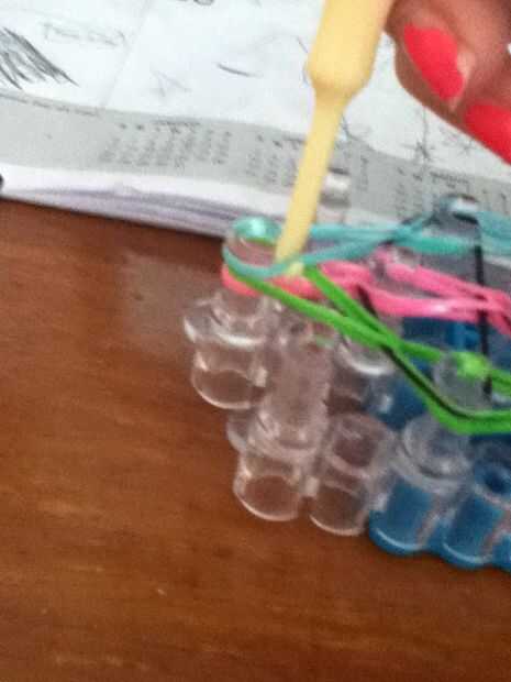 se necesita: un telar del arco iris, un gancho, bandas de goma y de un ' clip o clip de 'c'.Paso 1: Colocación de las bandas Con las bandas de color de rosa, mueva la banda de la clavija central a la izquierda e ir en línea recta hasta el segundo d a