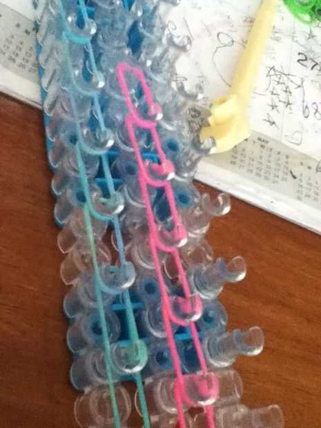 se necesita: un telar del arco iris, un gancho, bandas de goma y de un ' clip o clip de 'c'.Paso 1: Colocación de las bandas Con las bandas de color de rosa, mueva la banda de la clavija central a la izquierda e ir en línea recta hasta el segundo d a