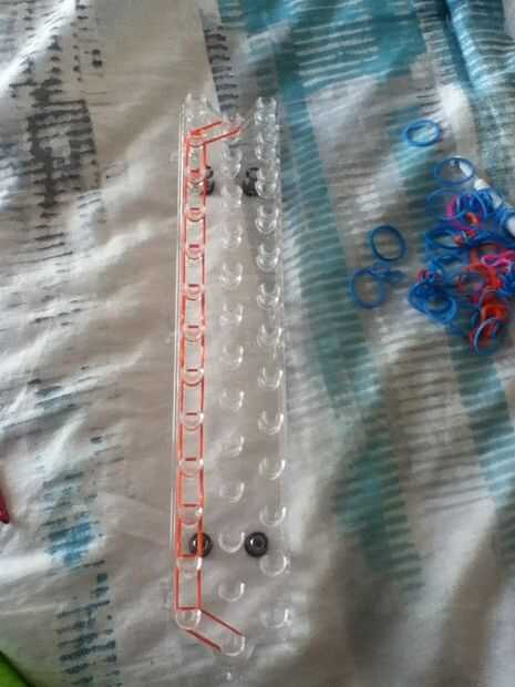 Paso 1: configuración Puesta a punto su arco iris del telar para que las clavijas están en hileras en forma de "v", no rectas.Paso 2: a partir de Tomar una banda de color de su elección y tomar de la clavija izquierda inferior en la segunda clav