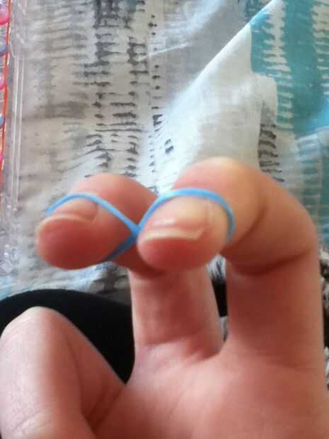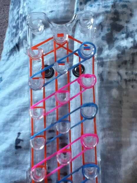 Paso 1: configuración Puesta a punto su arco iris del telar para que las clavijas están en hileras en forma de "v", no rectas.Paso 2: a partir de Tomar una banda de color de su elección y tomar de la clavija izquierda inferior en la segunda clav
