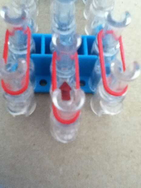 hagamos un triple solo! Vas a necesitar, su telar, gancho y bandas. Y uno C / clip S.Paso 1: bandas Agarrar 12 bandas de su color y asegúrese de que la flecha del telar es hacia arriba. Comenzar colocando tus bandas en el lado izquierdo. Ir hacia arr