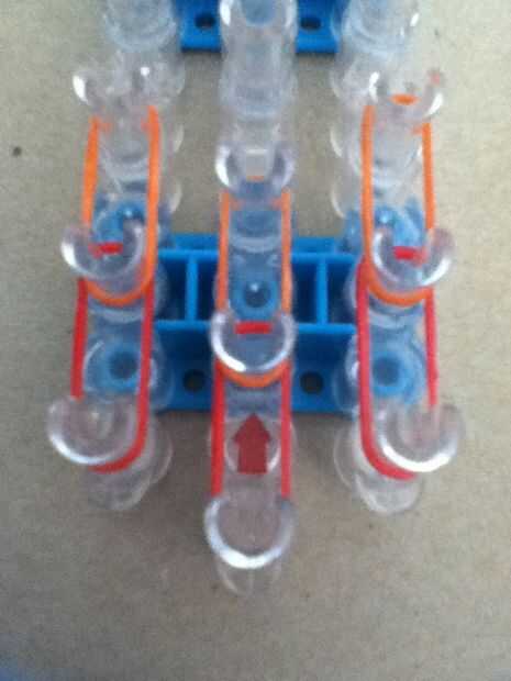 Tomar una banda de color de su elección y tomar de la clavija izquierda inferior en la segunda clavija izquierda. Luego, hacer lo mismo de la clavija central de fondo con la segunda clavija central. Luego el mismo de la clavija derecha inferior en la segunda clavija derecha. Continúe esto hasta el telar del arco iris.