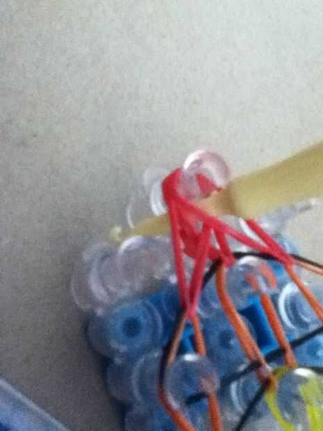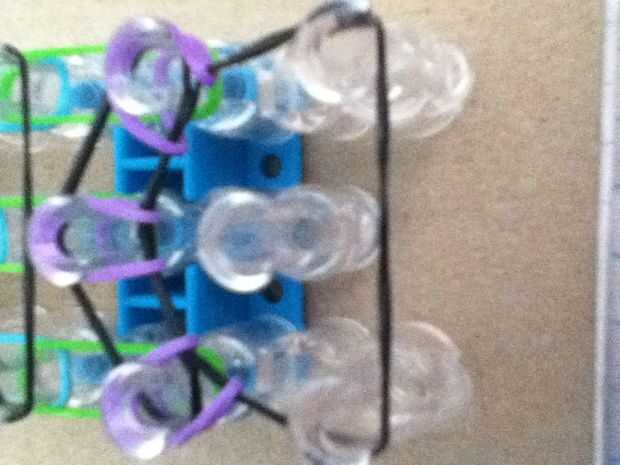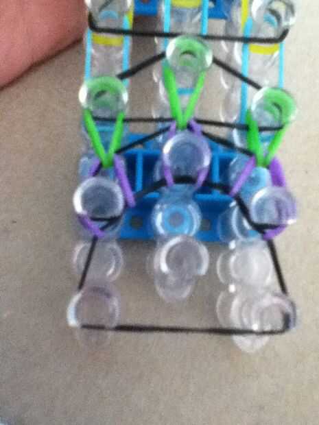 Tomar su gancho y ponerlo a través de la banda centro y coge la venda coloreada. Tire esa banda coloreada en la clavija superior. Hacer todo el camino hasta el telar en todas las filas de tres.
