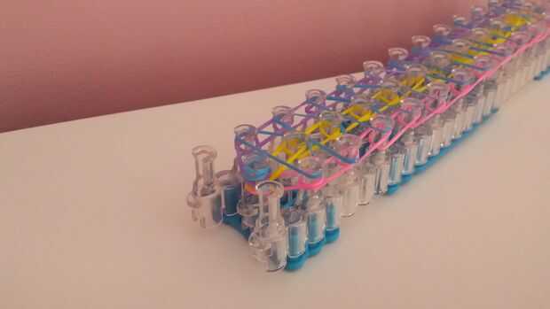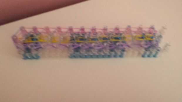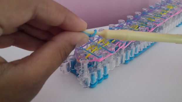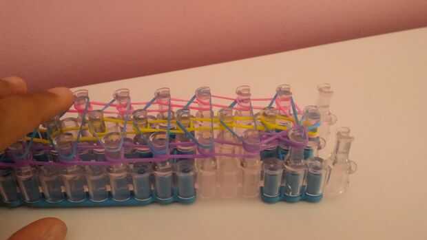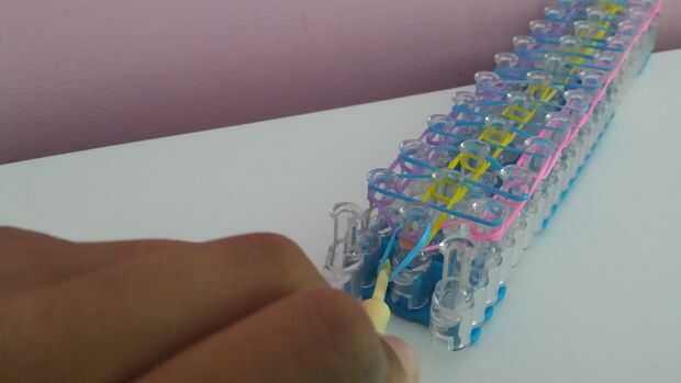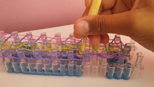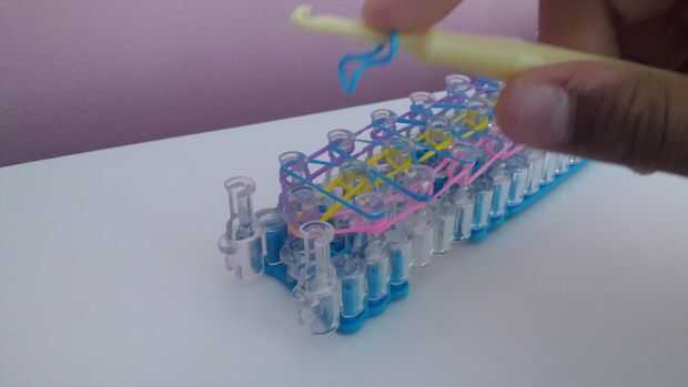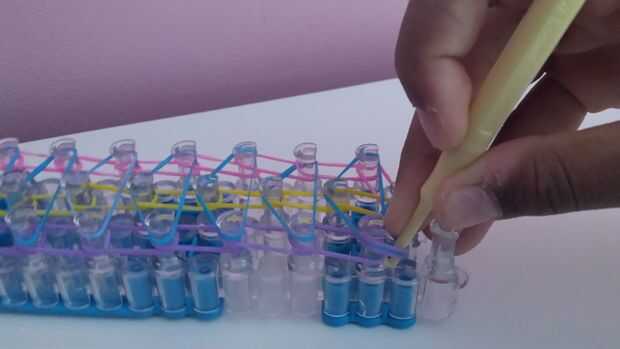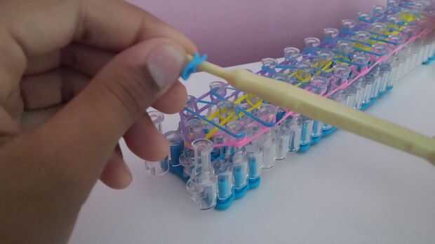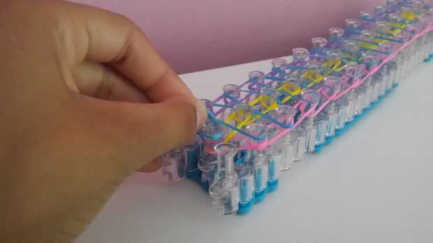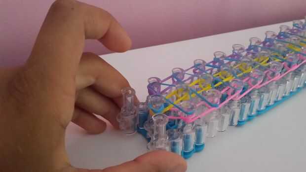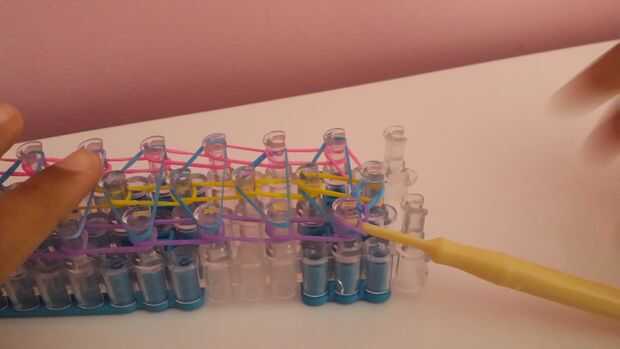 Tienes que colocar una banda de la tapa en el extremo de su telar, luego tire hacia atrás la banda de la tapa y subir la primera banda y tejer sobre hacer esto para todas las filas