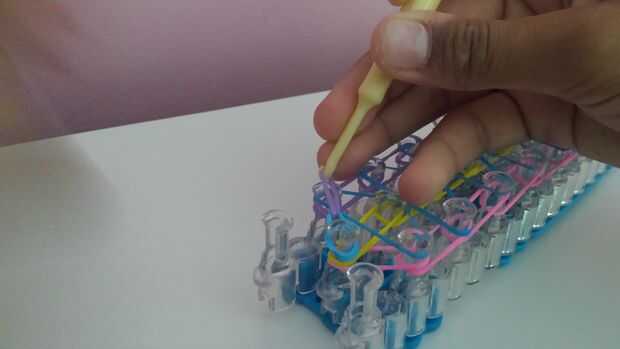Paso 1: configuración Puesta a punto su arco iris del telar para que las clavijas están en hileras en forma de "v", no rectas.Paso 2: a partir de Tomar una banda de color de su elección y tomar de la clavija izquierda inferior en la segunda clav