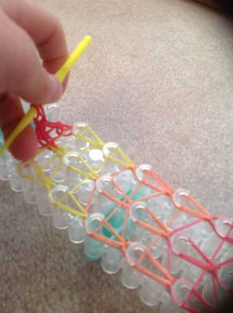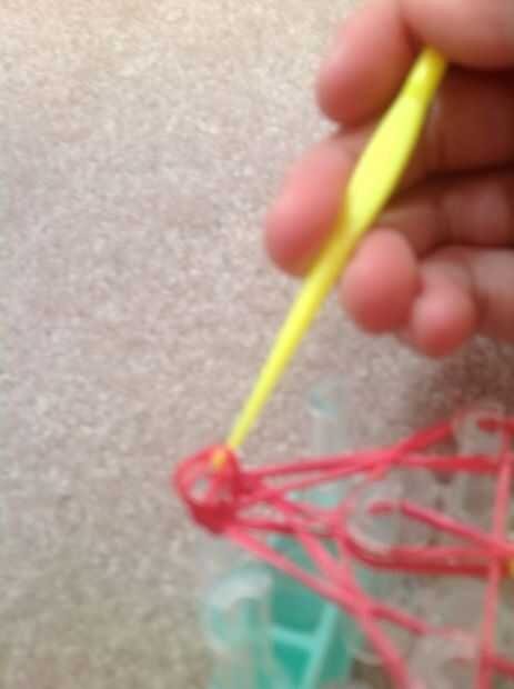 Tomar otra banda de color misma y colóquelo en su anzuelo y páselo a través de todas las bandas en la parte superior. Tomar la mitad de la banda y coloque en el gancho. Puso sus bandas en la parte más gruesa del gancho y cuidadosamente retirar su brazalete de ser suave para no ajustar cualquier bandas.