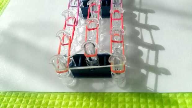 se necesita: un telar del arco iris, un gancho, bandas de goma y de un ' clip o clip de 'c'.Paso 1: Colocación de las bandas Con las bandas de color de rosa, mueva la banda de la clavija central a la izquierda e ir en línea recta hasta el segundo d a