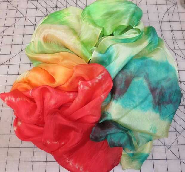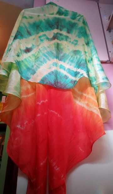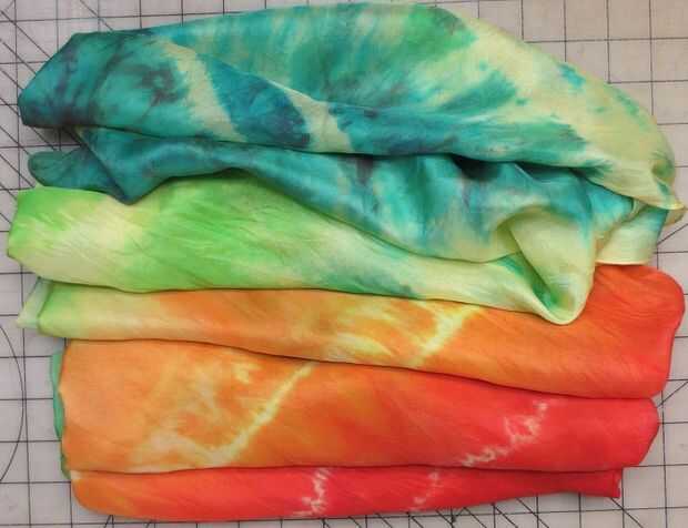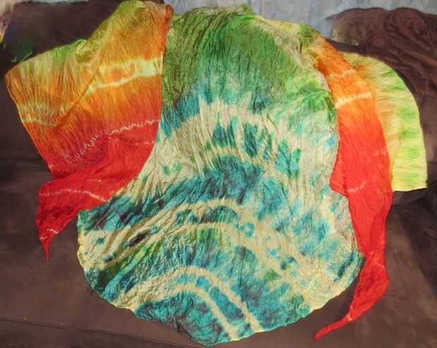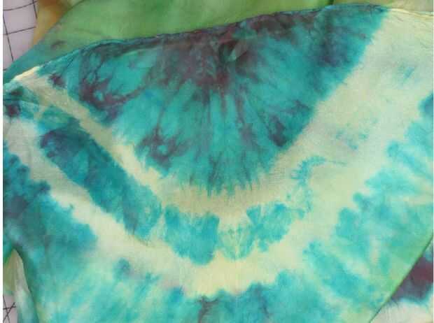 Puede utilizar este método para todos los tipos de seda. Los resultados son hermosos! Una vez que lo hace, usted querrá hacer más. Es todo un experimento! ¡ Déle un intento! Nunca he hecho una pieza que no gire bien. He sobre camisas de seda vieja teñidas de tienda con grandes resultados.
