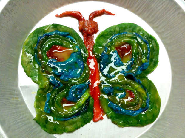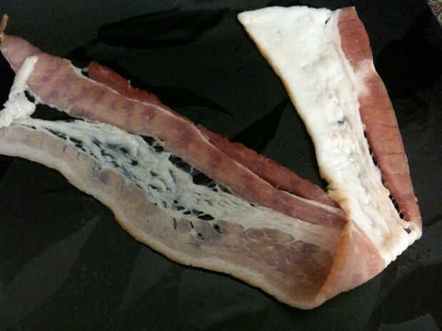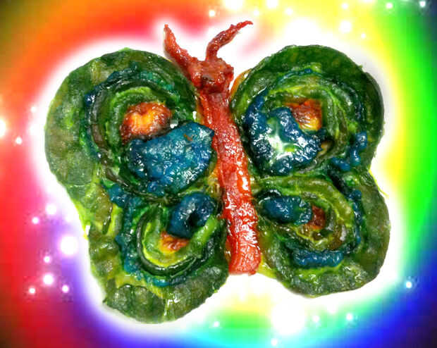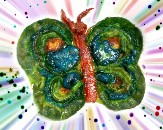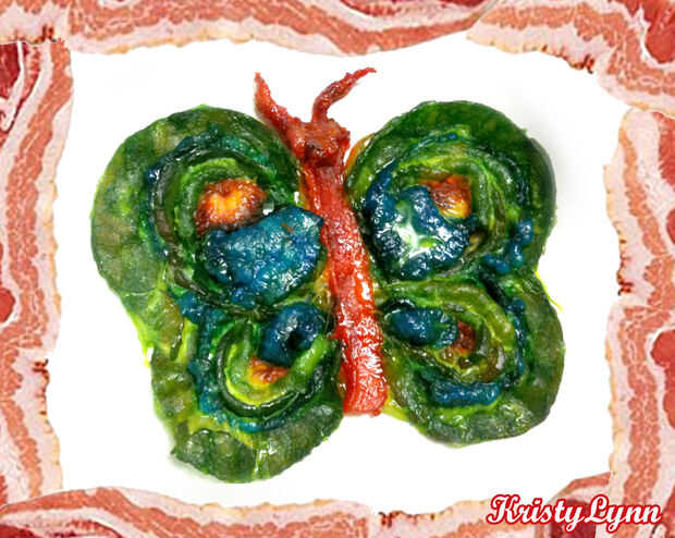 Para aquellos de ustedes que realmente les gusta hacer cosas extrañas, presento a usted, el teñido, al horno, tocino mariposa! Tomé mucha atención y tiempo en teñido, formar, capa, hornear, volver a hornear y dejar que mi resto insectos cutie para que vino hacia fuera de la manera en que quería que. Cuando juegas con tocino, totalmente pasa por una metamorfosis cuando se cocinan. Al igual que el proceso en el que una mariposa pasa a través de cambios en la vida antes de que puede volar. Lo mismo va para mi mariposa de tocino. Y ahora está muerto. Porque nos rasgó es alas y ponerlos en burritos.