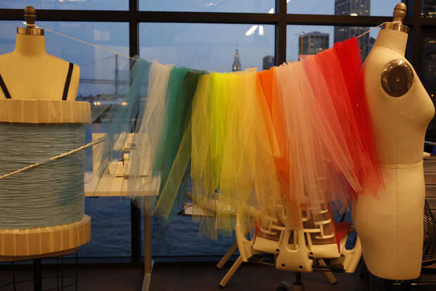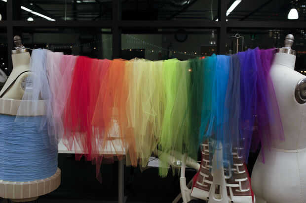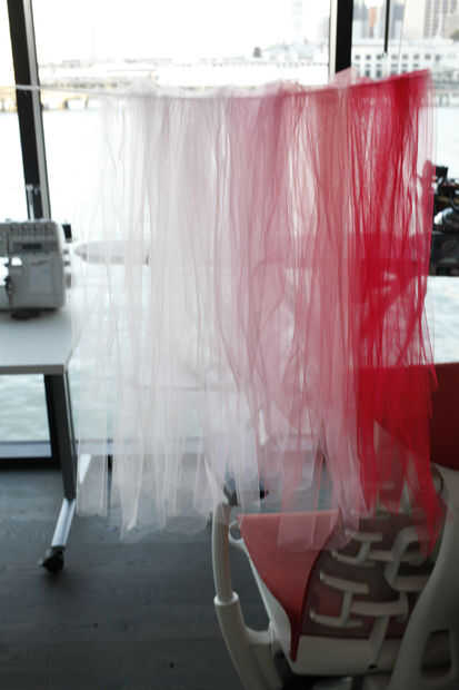El tul comienza a acumular, así como que estaba navegando a lo largo, extendí un trozo de hilo entre dos formas de vestido para colgar en. Esto me permitió configurar cómo quería que los colores fluyan y también si tendría suficiente pedazos de tul para llenar un tutu completo.