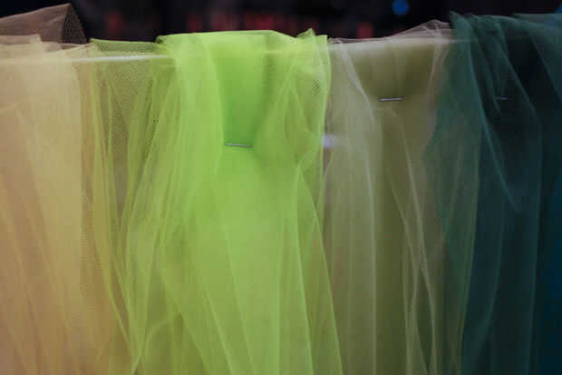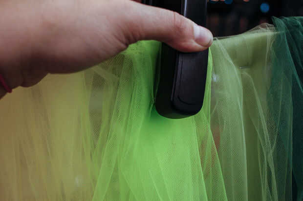 Hice esto y más tarde se dio cuenta era probablemente innecesario, pero sin duda me ayudó a mantenerla organizada cuando estaba tirando de la cadena. Utilizando unas tijeras para alambre, pude cortar fácilmente las grapas de la tul sin dañarlo.
