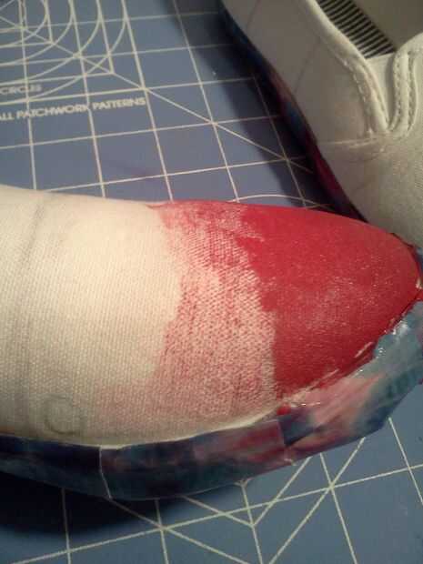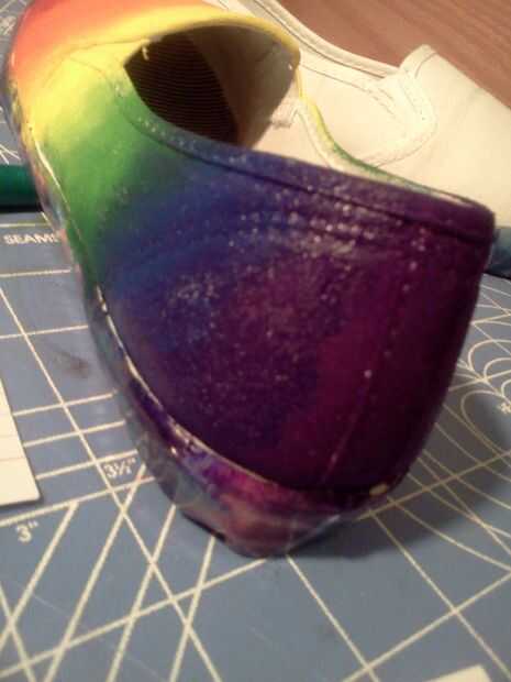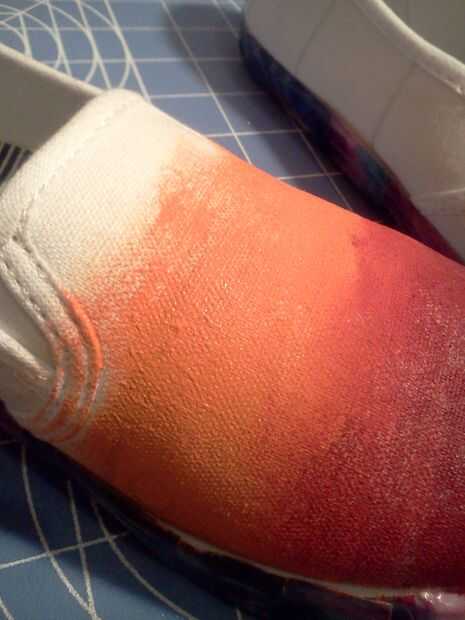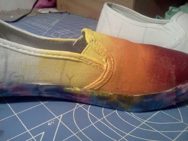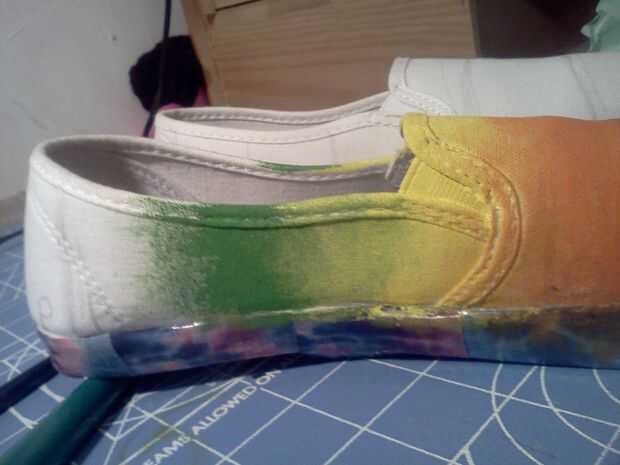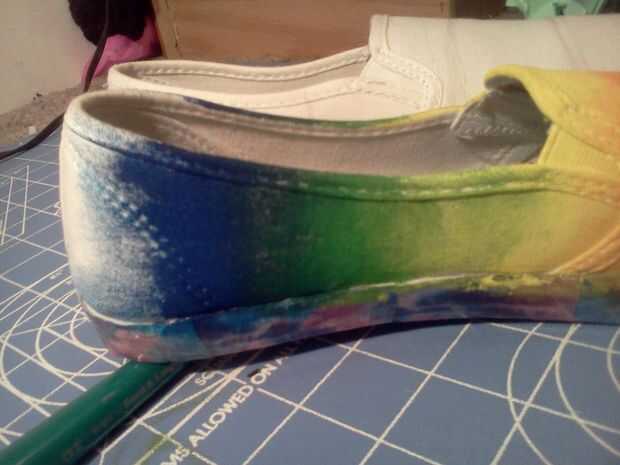 Ok ahora desde la punta del zapato con el color rojo o cualquier color usted quiere comenzar con. Pantalla ligeramente sobre la línea con el rojo sobre en la naranja. Luego pintar la naranja y mezcla con el rojo en la línea hasta la parte blanca se cubre y se mezcla bien. Ahora tienes que sombrear ligeramente sobre en amarillo con el naranja. Mezcla y pintura es amarillo hasta llegar cerca de la línea. Entonces usted será ligeramente la cortina sobre en el verde. Repetir este patrón hasta llegar el talón de la zapatilla. Te recomiendo pintar de un zapato en un tiempo y dejar que se seque durante la noche. Después hay seco les cubra con su sellador de su elección.