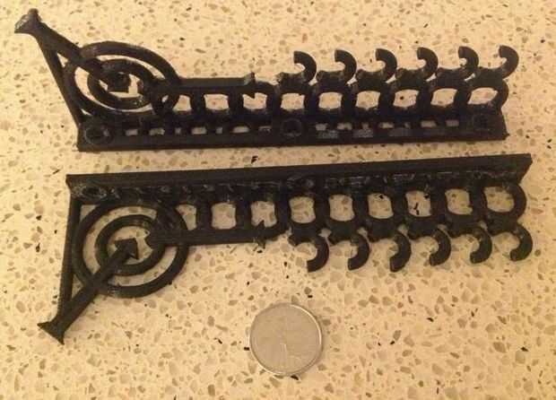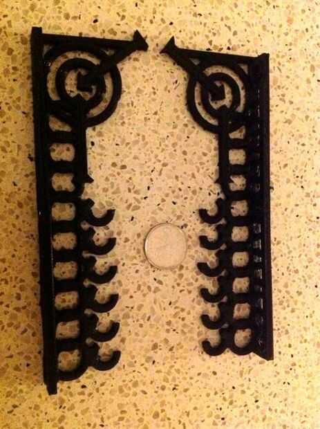 Así que diseñé una rejilla de dos piezas para imprimir 3D que estrechamente se monta en la pared y tiene seis ganchos en los cuales pueden ajustar las flechas.   El diseño tiene el espacio suficiente entre los ganchos a cuenta para remeras, siempre y cuando la orientación de cada flechas sucesivas se alternan.