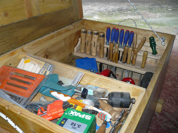 En el lateral del otro lado, se pone un soporte para limas, formones, gubias o destornilladores. Solo esta atornillado, porque nunca se sabe cuando hay cambiar la configuracion del soporte.