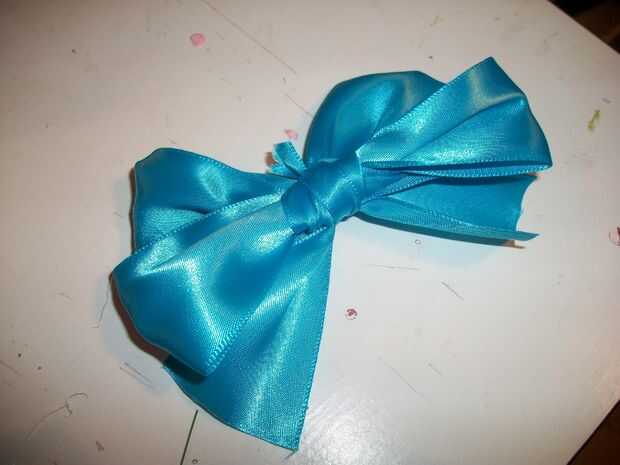 Cortar la cinta de skinner y atar un arco más pequeño. Dejar los hilos un poco largo porque se haga un nudo en ellos más adelante.