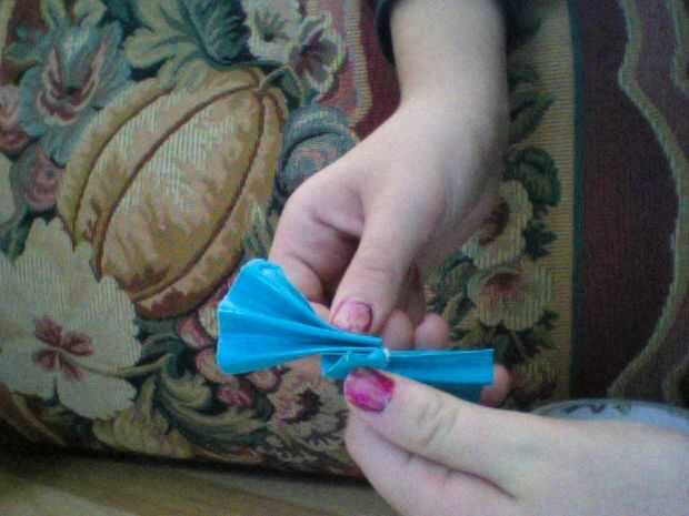 arcos de la cinta del conducto para nada!! cabello, monederos, nada que pensar!Paso 1: tome un pedazo de cinta del conducto como tal.Paso 2: doble por la mitadPaso 3: pellizcar en el medioPaso 4: poner una pequeña franja en el centro y envolver alred