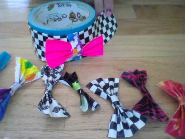 arcos de la cinta del conducto para nada!! cabello, monederos, nada que pensar!Paso 1: tome un pedazo de cinta del conducto como tal.Paso 2: doble por la mitadPaso 3: pellizcar en el medioPaso 4: poner una pequeña franja en el centro y envolver alred