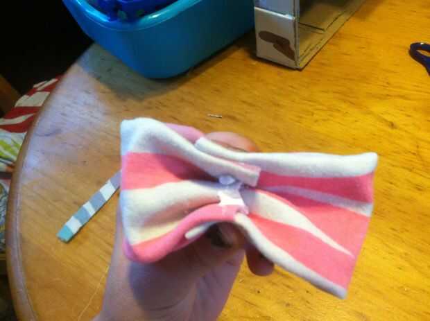 a continuación aprieta la tela en el centro, coloque unas pocas gotas de líquido puntada en el centro y mantenga pulsado durante unos segundos. Mientras se seca por un momento, cortar una fina tira de la camisa, para la pieza central del arco.