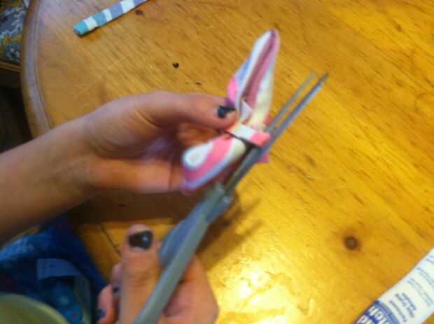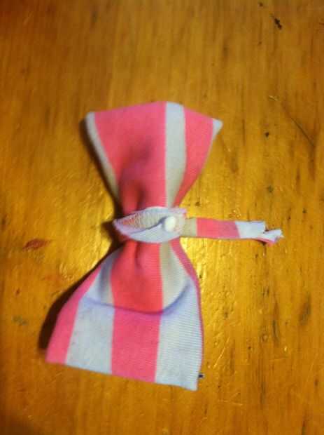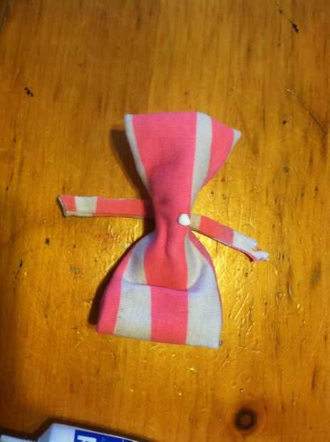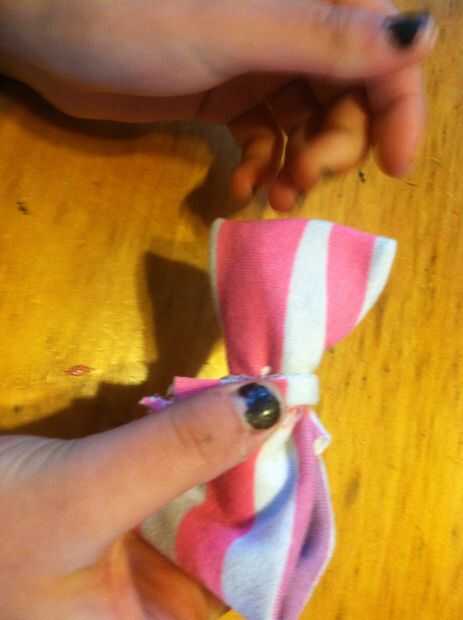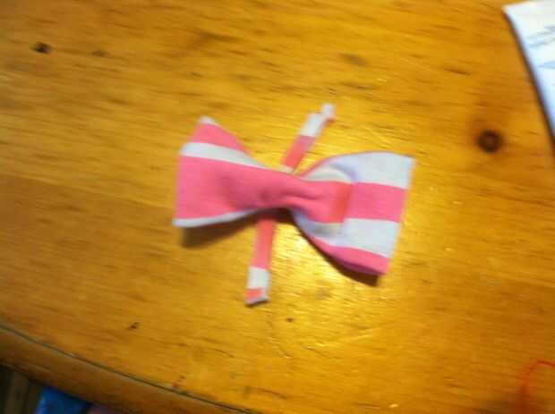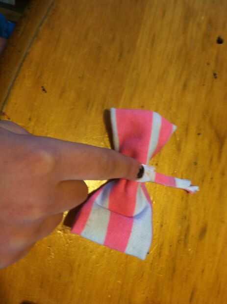 Poner su proa invertida en la tira de tela. Añadir un punto de líquido puntada en el medio del arco y poner un extremo de la tira en él. Presionar durante unos segundos y añadir otro punto de puntada líquida a la mitad del arco. Apriete el otro extremo en la parte superior del punto de puntada líquida y mantenga pulsado durante unos segundos. Corte de tela de cualquier exceso.