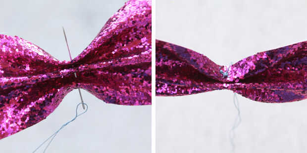 Con el hilo y la aguja quiere reforzar su centro de costura juntos un par de veces. Sostiene mi pliegues con sujeción a uno de mis clips de pelo sobre ella. Esto me permitió a coser a través de las capas sin perder la forma del arco. Ate y corte el hilo sobrante.