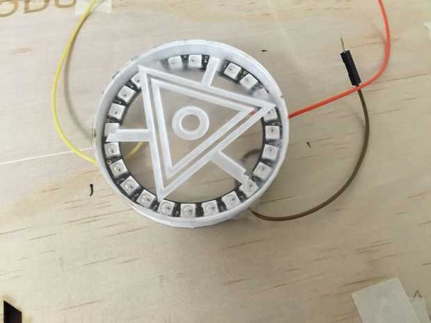 3. diseñar un patrón para el repulsor y cortado con láserlo en una hoja de acrílico transparente. Pegue este patrón sobre el soporte con el anillo de NeoPixel dentro de ella. Su aparato debe mirar como ahora.