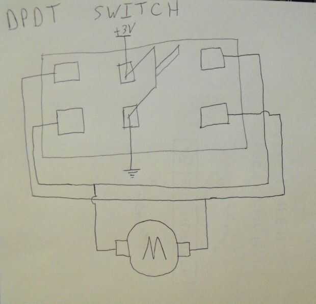 Los motores que impulsan la niveladora están controlados por los interruptores de doble polo doble tiro (DPDT) que conforman el controlador. He añadido un diagrama sobre cómo conectar su propio interruptor DPDT para controlar un motor ya que más tarde terminan controlando el motor de barrido con otro interruptor DPDT. Esperemos que el diagrama pone de manifiesto que el interruptor cuando está lanzado de una manera hace que el motor gire a una forma y cuando el otro da vuelta al revés.
