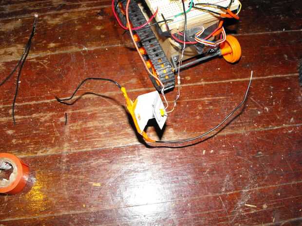 Para realmente construir el sensor usé mi fiel pedazo de chatarra y dobla un pedazo rectangular de él en forma de U. Taladré un agujero para montar en el lado de Ard-e y luego dos agujeros para los LEDs y el sensor de luz para adaptarse a. Había montado la Ard-e para que el led brilla a la derecha a través del centro de los agujeros en los peldaños hacia el sensor de luz. Puse el sensor de luz en la parte superior de la y luego poner alguna cinta aislante alrededor de los lados de usted para bloquear algunos de la luz ambiental que sería estropear las lecturas del sensor de luz. Entonces conecté los sensores de luz al igual que conecté para hacer sentido de Ard-e donde es la luz más brillante, como un divisor de tensión para una analógica de entrada (usando el mismo pines de entrada y resistencias como los "ojos" de Ard-e). El led fue soldado a una resistencia de tamaño para permitir que se ejecute fuera de 5V y luego conectado a la alimentación por el Arduino.