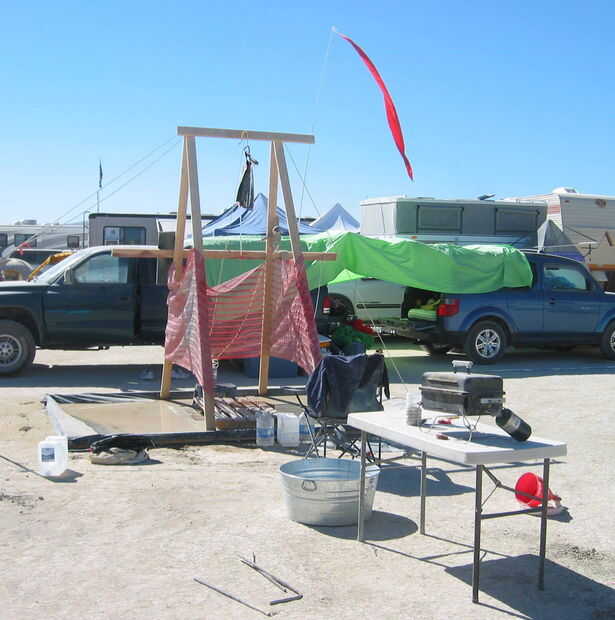 Observe las estacas de tienda tendido en el suelo - hecho de re-varilla con el extremo doblado sobre para hacerlos menos peligrosos. Las piezas de tubería se utilizan para doblar la varilla de re.