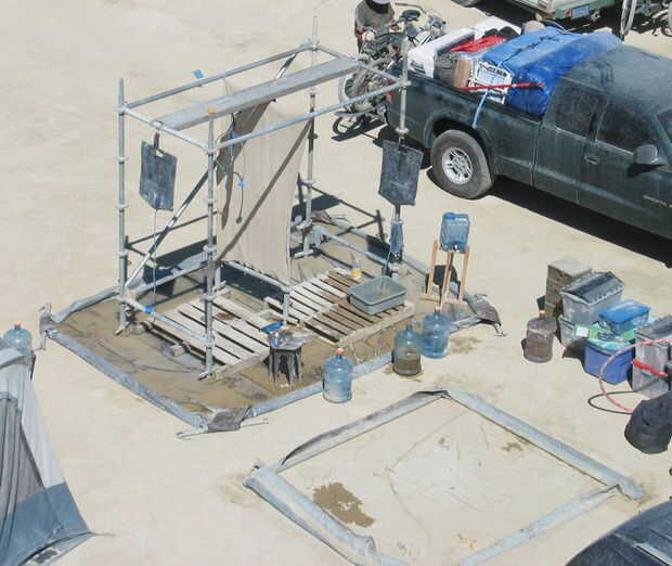 El marco quedado sobre andamios de estructura de la enorme torre del campo. La plataforma de baño es un par de palets de madera. Hay un estanque de aguas grises extra está construyendo para el manejo de las aguas grises se almacenan en jarras de agua de 5 galones.