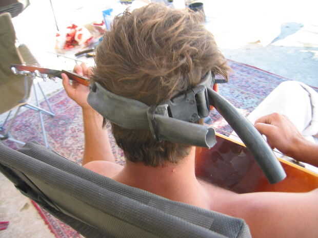 Él no estaba satisfecho con la correa de sus gafas, así que hice uno nuevo de una cámara de bicicleta.
