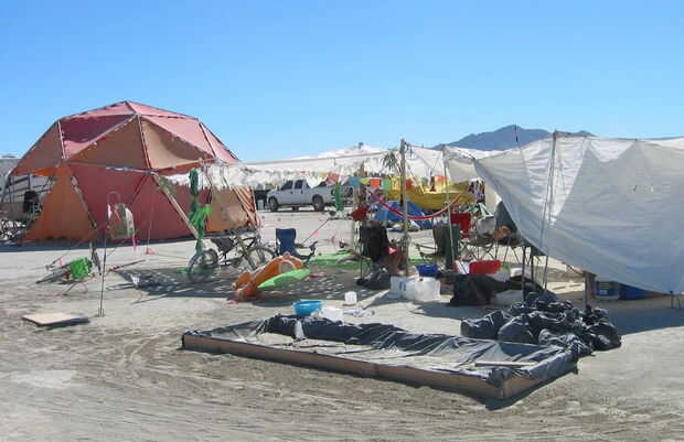Aquí es el tipo más simple de aguas grises evaporador. Es algunas ramitas en el suelo para sostener los bordes de una lona negra. El agua de lavado usada recibe vertido aquí y se evapora, dejando unas costra crud. Se acompaña la lona y lanzado lejos en algún lugar lejos de la playa.