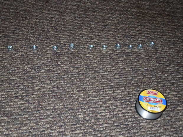 2.) la línea de corte a la altura de su estructura (porche, etc.) y coloque un peso de ningún tipo en un extremo de cada longitud (yo usé tuercas 5/16)